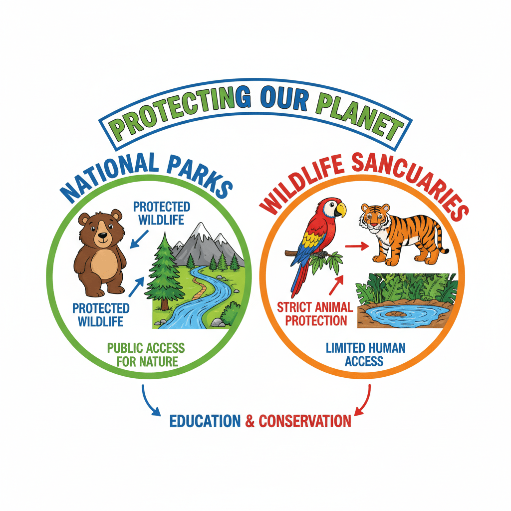 National parks and sanctuaries are areas established for the conservation of plants and animals. Bharatpur Sanctuary and Kaziranga National Park are examples of such areas.